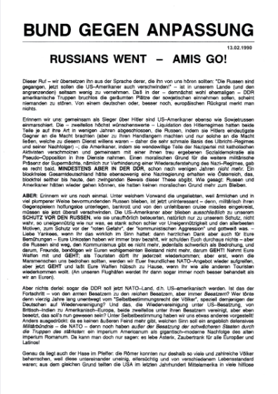 Dieses Flugblatt verteilten wir knapp drei Monate nach dem Mauerfall und acht Monate vor der »Wiedervereinigung« 1990, treffender Annexion (da die DDR keinerlei Gegenleistungen wie z.B. Fristenlösung fordern konnte), unter einigen Opfern im gesamten Ostdeutschland. Die Resonanz war mäßig; ein ganzer Sack voll Illusionen war leider größer als der Wille zum Begreifen. Wenn jetzt auf dezentralen, zersplitterten und von der »Anti«-FA oder zunehmender Staatsaggression bedrohten Demonstrationen immer öfter der Ruf erschallt »Amis go!«, wo das Kind schon weitgehend in den Brunnen gefallen ist, so ist es sehr traurig und bitter – und die US-Monoimperialisten können sich zufrieden die Hände reiben –, daß 32 Jahre ungenutzt, ohne entschlossenen Kampf für diese Forderung verstrichen sind, und wie folgenreich... Beispielsweise hätte Rußland bei entsprechendem Protest in Deutschland nicht so leicht von der NATO umzingelt werden können... Einfach selber weiterdenken.