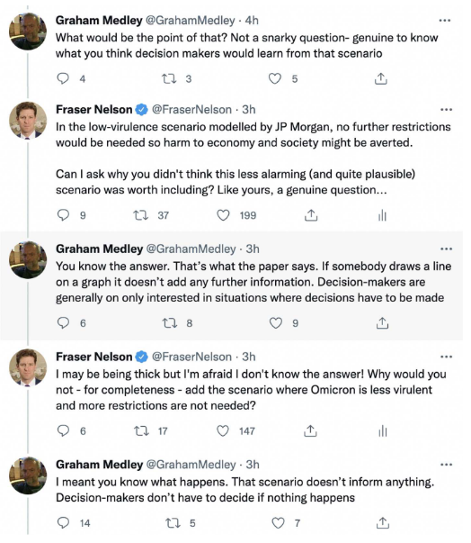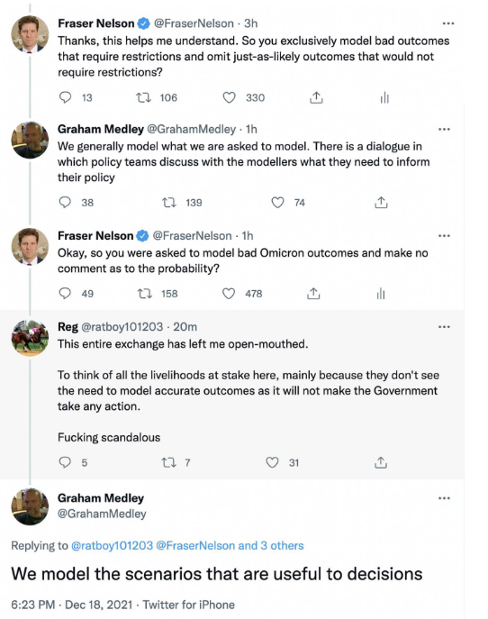 Die britische Zeitschrift »The Spectator« hatte seit einer Weile immer wieder die Modellrechnungen von SAGE (Scientific Advisory Group for Emergencies) – laut Wikipedia und Selbstdarstellung eine Gruppe von sog. »unabhängigen« Wissenschaftlern, die die englische Regierung seit 2009 (erstmals bei der Schweinegrippe) in Notfällen »berät«, um die »richtigen« Entscheidungen und »Maßnahmen« treffen zu können, und die somit exakt strukturparallel zu und genauso »weise« wie Drosten, Wieler und Co. ist – mit den realen Zahlen verglichen und dabei festgestellt, daß diese in allen Fällen und selbst bei »Best-Case-Szenarien« weit unter allen Modellrechnungen lagen.* Im letzten Fall bzgl. der sog. Omikron-Welle war dem Herausgeber der Zeitschrift, Fraser Nelson, aufgefallen, daß SAGE nur noch das »Worst-Case-Szenario« unter der Annahme, daß Omikron genauso tödlich wie Delta sei, mit bis zu 6000 Toten pro Tag (!), veröffentlicht hatte, was nur durch erhebliche neue »Maßnahmen« bis zum erneuten Lockdown zu verhindern sei, so der Ratschlag an die Regierung, und natürlich auch das, was die Wahrheitspresse der breiten Öffentlichkeit mal wieder präsentierte. Deshalb hatte er sich in einem Twitter-Gespräch an den Vorsitzenden des SAGE-Covid-Modellierungskomitees, den Epidemiologen Prof. Graham Medley, gewandt, um ihn zu fragen, warum er kein Szenario mit geringerer Virulenz einbezogen habe, da dies nach allen vorliegenden Daten zu Omikron doch sehr wahrscheinlich sei und dann die Zahl der hospitalisierten Covid-Patienten ohne weitere Einschränkungen laut der viel realistischeren Statistik von JP Morgan nur bei 33,6 % des Spit-zenswerts vom Januar 2021 läge. Hier der sich anschließende Twitter-Dialog** vom 18.12.2021: