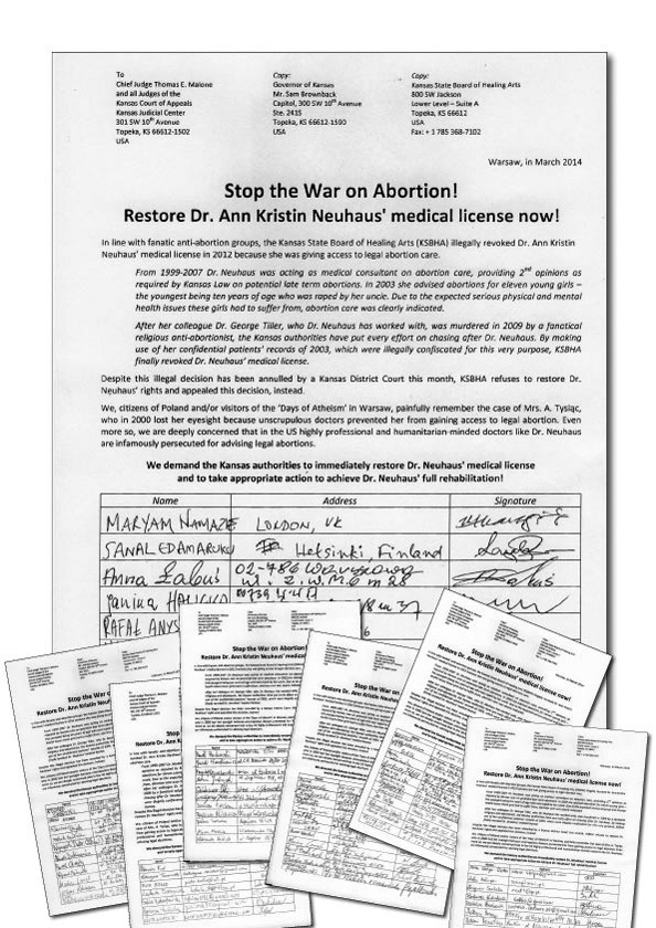 Zum Hintergrund der Verfolgung von Dr. Neuhaus: Abgekartet mit fanatischen und militanten Anti-Abtreibungsorganisationen hat das Kansas State Board of Healing Arts (KSBHA) [staatliche Zulassungsbehörde für Heilberufe] im Juni 2012 der Ärztin Dr. Ann Kristin Neuhaus wegen ihres Einsatzes für legale Abtreibungen in einem rechtswidrigen Verfahren die Approbation entzogen und zur Zahlung ruinöser Verfahrenskosten in Höhe von 92.000,- US-Dollar verurteilt.Dr. Neuhaus erstellte in den Jahren 1999-2007 für ihren Kollegen Dr. George Tiller die gesetzlich geforderten Zweitmeinungsgutachten für potentielle Spätabtreibungen, so auch im Jahr 2003 für 11 Mädchen im Alter von 10 bis 18 Jahren, die jüngste war von ihrem Onkel vergewaltigt worden. Aufgrund dieser, vom Staatsanwalt illegal konfiszierten, vertraulichen Patientenakten wurde Dr. Neuhaus verurteilt. Nachdem Dr. Tiller, der jahrzehntelang verfolgt, bedroht und schikaniert worden war, schließlich 2009 von einem dieser fanatisch religiösen "Lebensretter" auf offener Straße ermordet wurde, fokussierten sich die staatlichen Behörden und militanten Anti-Abtreibungsaktivisten mit aller Kraft auf Dr. Neuhaus.