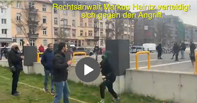 Angriff auf den Querdenker-Rechtsanwalt Markus Haintz auf der Demonstration unter dem Motto "Wie viel kann man euch noch glauben? - Medienkritik und Kulturerhalt" am 11. April 2021 in Frankfurt. Man beachte, wie schnell die Polizei den Angegriffenen Markus Haintz brutal überfiel, während die Provokateurin und Gewalttäterin nicht belangt worden ist.